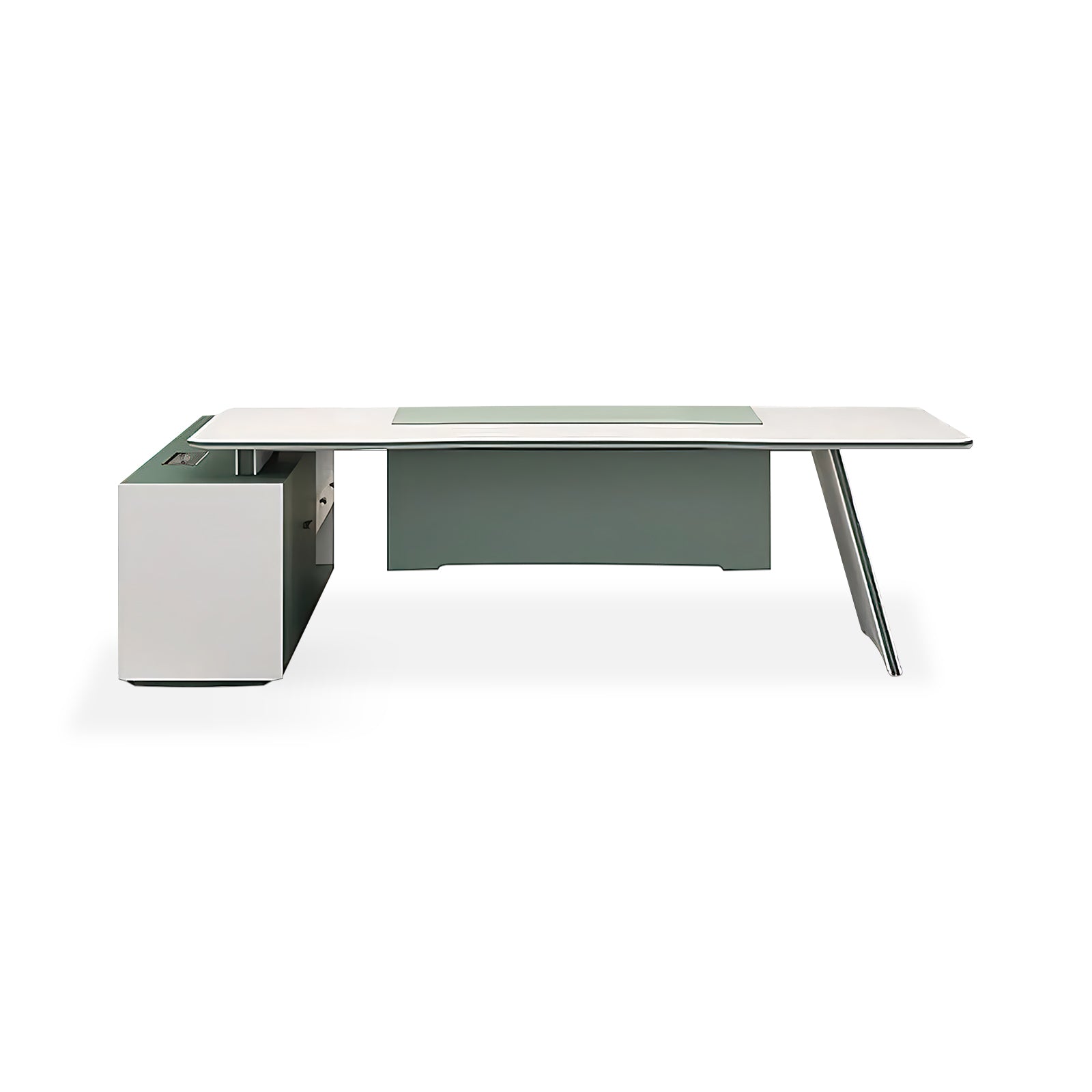 The Furnavo executive desk features a modern minimalist design with a large-capacity side cabinet, providing organized storage suitable for professional office environments.